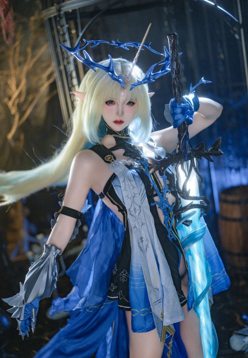 你們看看這個妝容!那個眼神殺我真的頂不住,冷豔中帶著一絲哀愁,完全就是芙露德莉丝本人啊!金色的長髮配上那個藍色的荊棘王冠,層次感拉滿。還有那身藍白相間的戰裙,細節處理得相當到位,特別是胸前的裝飾和腰帶的搭配,既保持了角色的英氣,又不失女性的柔美。手裡的長劍也做得超精緻,那個紋理和光澤度,一看就是用心之作。整個造型的色彩搭配也很棒,藍色系為主調,既高貴又不會太過張揚,完美還原了角色的氣質!