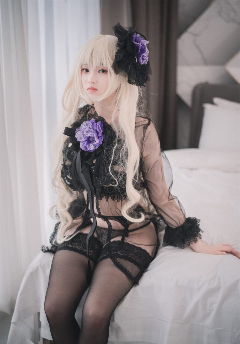 白金长发烫着慵懒的大卷,柔顺地垂落肩头,齐刘海衬得眉眼又纯又欲,发间的黑纱紫花装饰简直是神来之笔,瞬间戳中哥特洛丽塔的精髓~