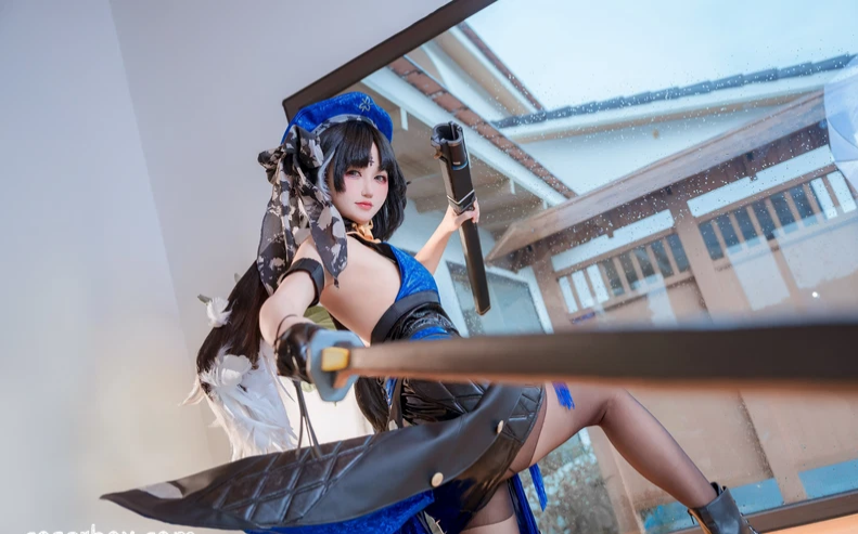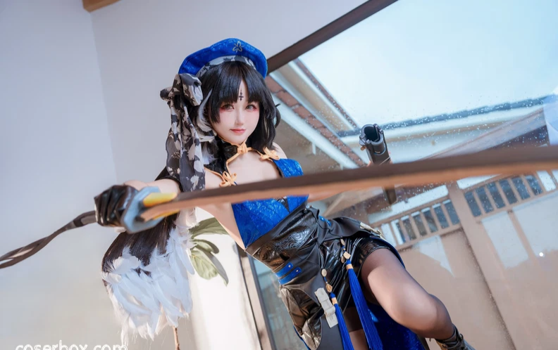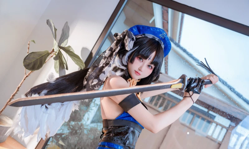 盯着画面细节看——她握刀的手臂绷得利落,指尖扣在刀柄的弧度透着劲儿,另一只手的姿态松松的,甜俏和凌厉就在这动作里揉开了;蓝帽的边缘衬着黑发,羽毛的白纹清晰,皮革衣料的褶皱顺着身体曲线,黑手套的纹路裹着手背;眼神直视镜头,眼尾的红调添了点俏,唇色淡粉又裹着甜,自然光在刀身泛着细闪,连窗边的玻璃反光都透着清透,这甜飒交织的神态谁扛得住啊?