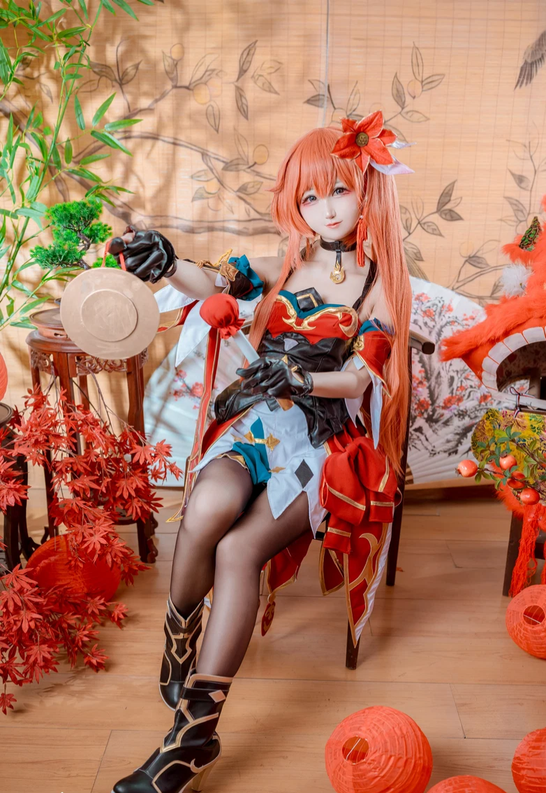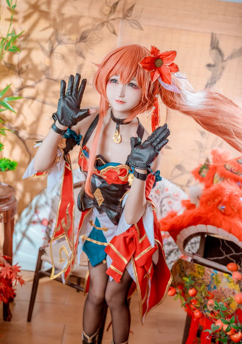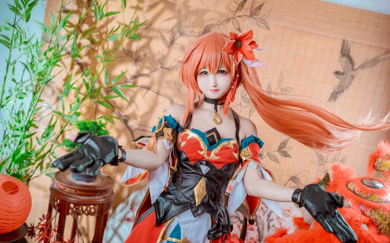 盯着画面细节看——kuukow倚在椅子上,握铜锣的手抬得俏生生的,指尖勾着锣绳的弧度透着活泼;橙红发垂在肩侧,发梢蹭着服饰的红边;眼神弯着望向镜头,唇色的甜粉裹着娇,暖光在红枫和灯笼上泛着柔润的光,连铜锣的木质感都看得清,这“甜飒小炮仗”的劲儿捏得刚好!
