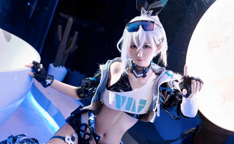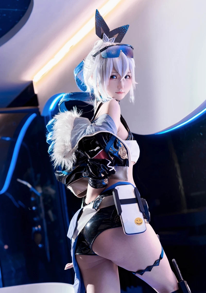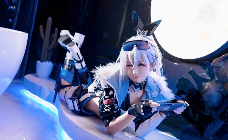 造型的还原和巧思绝了:银白发是银狼的标志,发间的兔耳装饰带着俏感,刚好中和科技风的冷;皮革与毛绒拼接的服饰,裹着赛博装备的金属细节,黑手套上的图案、腿侧的装备纹理,全是银狼“黑客大佬”的标识,毛绒边的软蓬又添了点娇,这“酷飒+软俏”的平衡太会了!