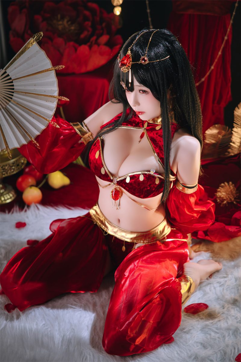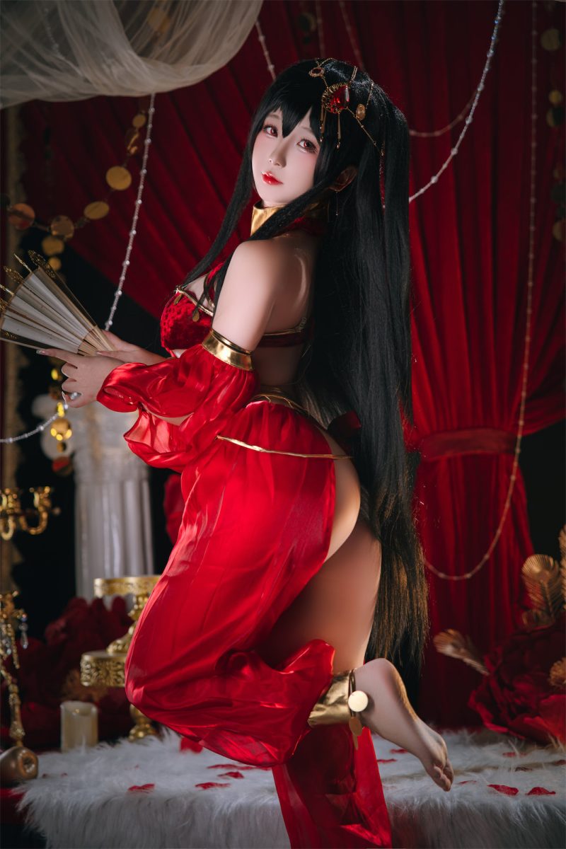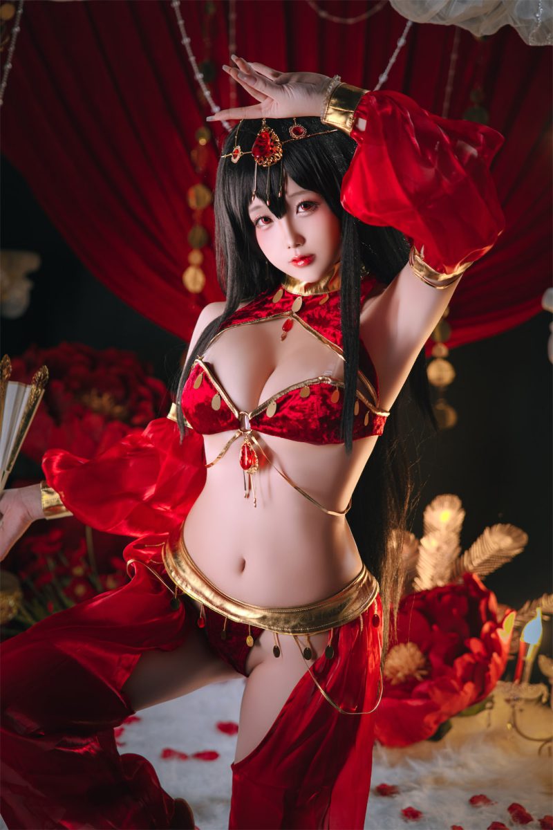 对比日奈娇之前的战国妖姬造型,那股子冷艳疏离的劲儿和这次大凤舞姬的明艳娇媚反差直接拉满!战国妖姬是暗夜红玫般的冷冽妖冶,而大凤舞姬是烈火牡丹般的炽热浓艳,同一个人能把碧蓝航线角色的“媚”和古风妖姬的“冷”演绎得这么极致,这角色理解力也太牛了吧!而且她连小细节都没放过,黑发上缀着的金红流苏发饰,和大凤的角色配色完美呼应,垂落的发丝轻贴脸颊,和白绒垫上的红花瓣相映成趣,这份用心直接让画面的故事感翻倍~
