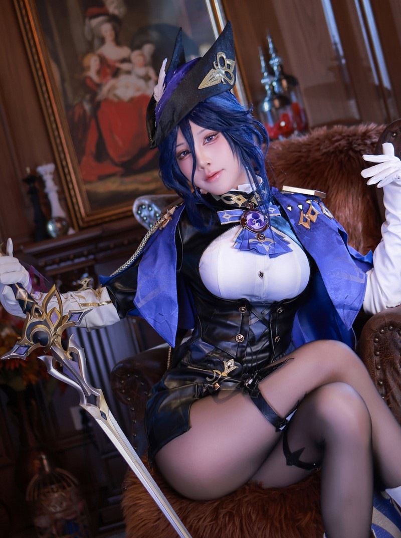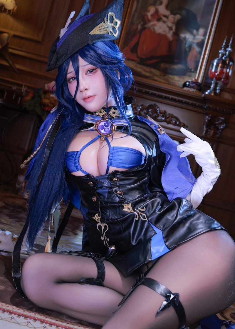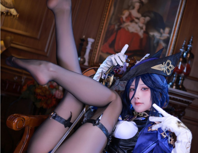 這次的克洛琳德作品更是讓她在國際coser圈又火了一把。藍色的長髮配上那頂標誌性的三角帽,還有胸前那個精緻的徽章——每一個元素都抓住了這位楓丹女劍士的精髓。