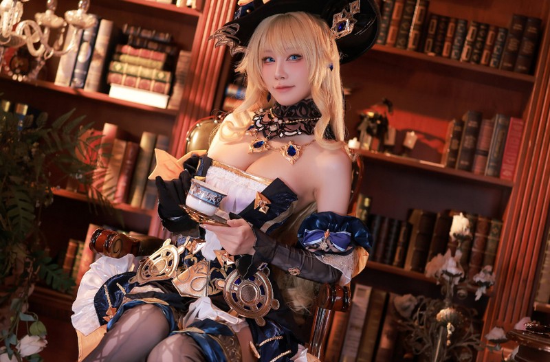 刷到水淼 aqua 這組原神娜維婭的 cos,直接被擊中啊!金色長卷髮配著復古風的寬邊帽,身上那套服裝藍白金三色搭得賊精緻 —— 腰間的裝飾像個小巧的儀式盤,手套上纏著蕾絲花紋,連絲襪都帶著隱隱的網格紋路~她坐在滿是舊書的復古房間裡,旁邊擺著三層甜點塔,手輕輕搭著骨瓷茶杯,整個氛圍就像從楓丹那個藝術感爆棚的國度裡走出來的貴族小姐,誰看了不心動啊?
