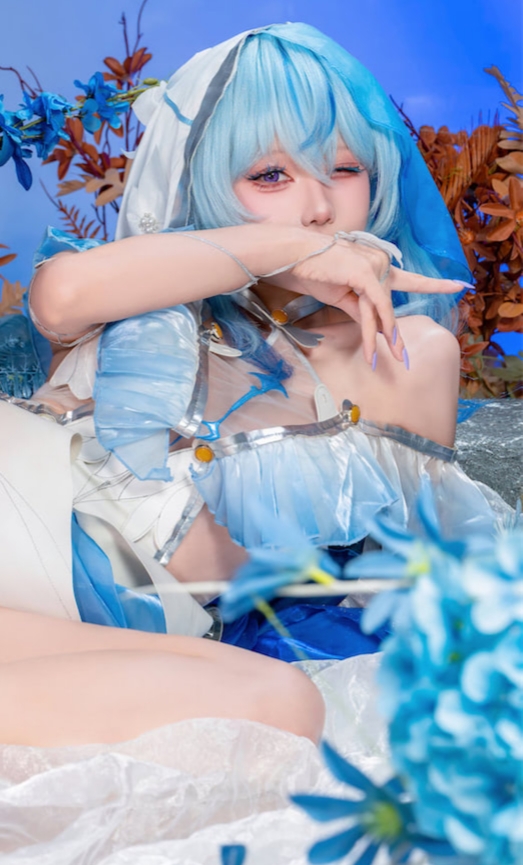 動作和場景簡直是神還原!兔娘站在鋪滿白色碎石的海岸邊,身後是霧蒙蒙的藍色背景,剛好對應遊戲裡的黑海岸場景。她左手輕握音感儀,機身朝著地面,右手抬起讓一隻藍色蝴蝶道具停在指尖,姿態輕盈得像要化蝶飛起——這個動作剛好還原了守岸人「召喚蝴蝶攻擊並回血」的技能,細節控直接狂喜!腳步輕輕分開,重心偏向一側,衣擺被微風吹起弧度,既有守護者的沉穩,又有少女的靈動,很難不愛啊~