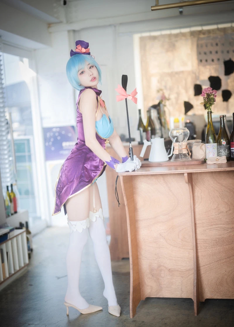 造型的巧思绝了:浅蓝短发是蕾姆的灵魂标志,发间的紫粉礼帽带着魔术俏皮感;紫蓝拼色的丝绒礼服是旗袍款,软乎乎的绒面裹着身形,金色盘扣添了中式细闪,白手套、带红星星的魔术杖,还有腿上的白花袜饰,全是魔术师的标志性细节,蓝紫主色又牢牢锚定了蕾姆的身份,这“蕾姆+魔术师”的混搭谁想出来的?太会了!