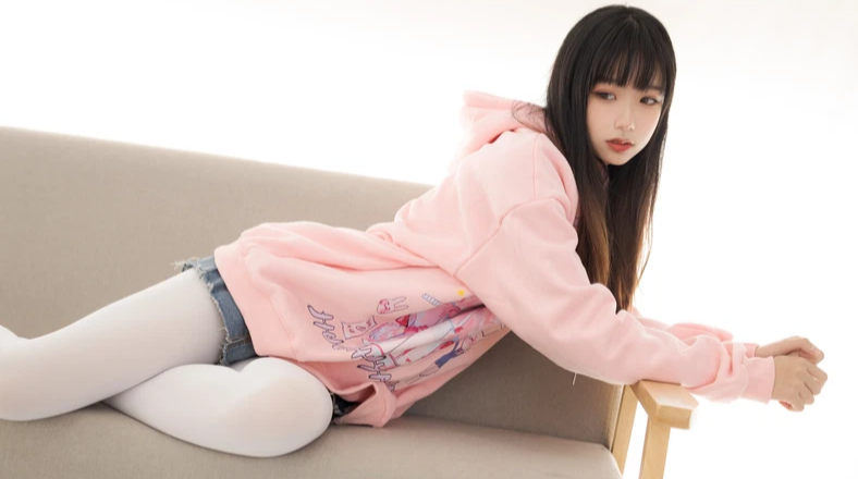第一张她侧躺在米色沙发上,粉色oversize卫衣松松垮垮地挂在身上,卫衣上的卡通印花还透着奶萌,搭配白丝和牛仔小短裤,手搭在椅边的动作慵懒又娇俏,活脱脱一只刚睡醒的小奶猫~