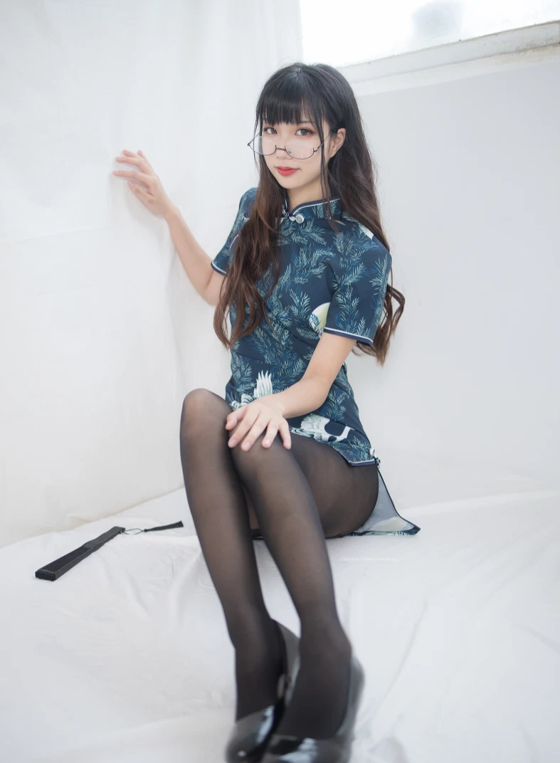 第五张穿藏青花纹短旗袍,黑丝配黑皮鞋还架了副细框眼镜,坐在白布景前抬手抵墙的动作又酷又媚,这波眼镜杀直接戳中XP暴击!